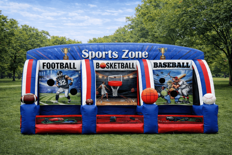 3-1 SPORTS ZONE GAMES — Three classic sports challenges in one eye-catching inflatable: baseball, basketball, and football. Each lane is clearly separated with themed backdrops and oversized soft props (bat, basketball, football, baseball) so players know where to aim. The baseball and football lanes feature target holes; the basketball lane has a hoop and net, making scoring simple and satisfying. Low front entries and roomy play wells let kids and adults toss, throw, and shoot safely, while sturdy walls and bright sporty graphics create an inviting, photo-ready centerpiece. Perfect for carnivals, school fun days, company picnics, and backyard parties, this rental supports quick rounds and short queues—ideal for timed contests, point tournaments, or free-play challenges. Durable and easy to set up, it turns casual guests into competitors and keeps the energy high throughout your event.