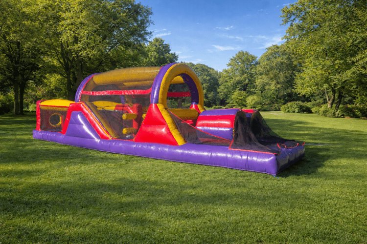 Backyard Obstacle Challenge offers 40 feet of challenge obstacle entertainment in one unit. This inflatable play structure takes participants on a larger journey through tunnels, around horiztontal and vertical pop-ups, with plenty of climbing and descending along the way! This sleek, low-profile Backyard Obstacle Challenge provides a bright, purple, yellow and red primary-colored theme and its arching design will attract attendees and keep them entertained. For a more compact unit, this Backyard Obstacle Challenge also comes in a jam-packed 30-foot model.This inflatable obstacle course can be an amazing centerpiece for an Indoor FEC or any backyard party. The inflatable play structure begins with a front-loading obstacle entrance, taking participants through tunnels and pop-ups to facilitate maneuvering skills and build confidence. The challenge obstacle then leads to an exciting front-exiting climb and slide, all to guarantee hours of enjoyable physical activity. Each inflatable play structure has mesh windows for easy viewing, and is constructed of the fire-resistant, lite n' strong vinyl for easy portability, durability and safety.