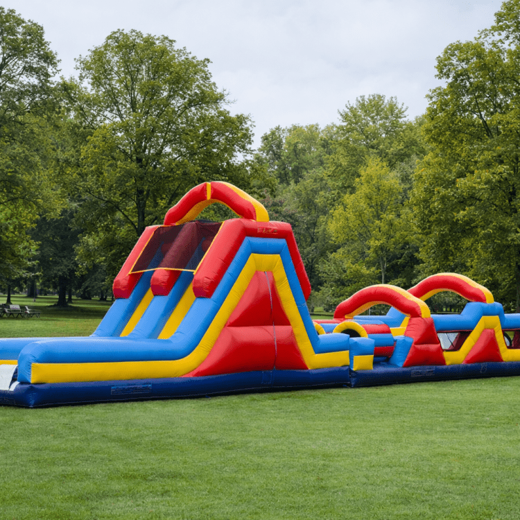 Stretching a full 80 feet, this Mega Monster Obstacle Course turns any yard or event space into an action-packed challenge course built for speed, skill, and nonstop fun. Bright, bold colors and a variety of features create an engaging route: crawl through tunnels, weave around pillars, scale towering walls, navigate angled obstacles, and race down a steep slide before sprinting to the finish. Designed for continuous play, the course accommodates multiple racers taking turns or competing head-to-head, making it perfect for birthday parties, school events, fundraisers, team-building days, and community festivals. Tough vinyl construction and secure anchoring points make setup reliable, while the open layout and clear sightlines help chaperones keep participants safe. Book this 80-foot monster for an exhilarating centerpiece that challenges endurance, coordination, and competitive spirit without needing specialized skills — just bring your energy and a sense of adventure.