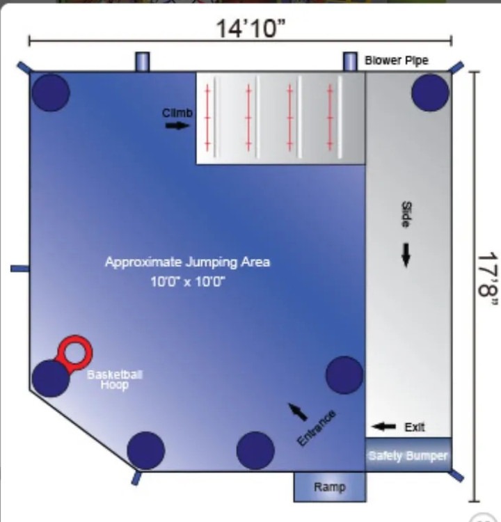 - OCCUPANCY: A maximum of 5-6 kids of equal size at one time for bounce houses, and 1 person at a time for slides is what most inflatable manufacturers recommend.