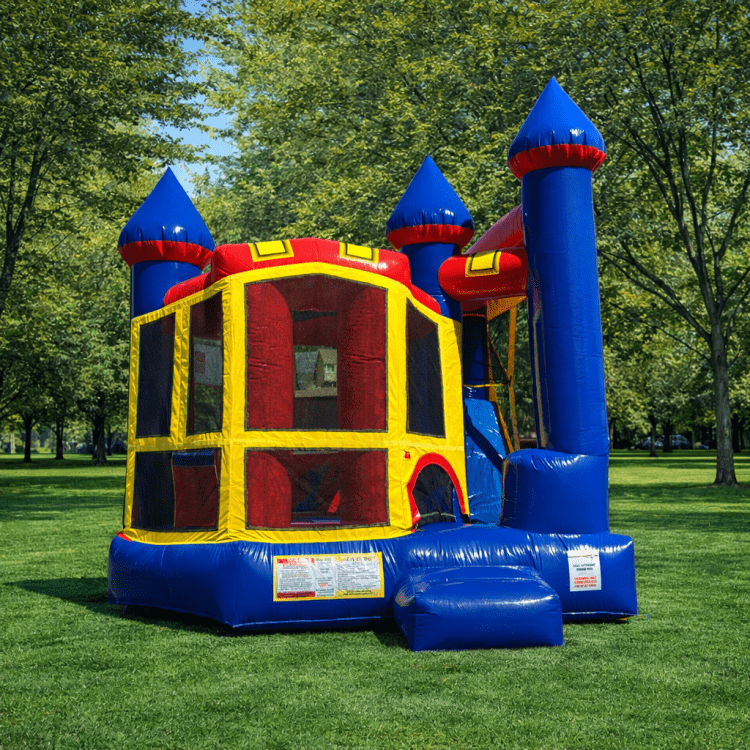 This colorful backyard combo is a four-in-one inflatable play unit that turns a backyard into a mini playground—perfect for birthday parties, family gatherings, or neighborhood fun. Kids enter up a small ramp into a roomy 10'×10' bounce area framed by bright mesh windows for airflow and easy supervision. Along one side a climbing lane leads up to an internal platform and a safe, slide-out exit so jumpers can climb, slide, and bounce in continuous play. The unit also includes a built-in basketball hoop for extra games, a safety bumper at the slide exit, and durable anchor points and blower connections for secure setup. Designed to fit most residential lawns, this multi-color combo blends active features in a compact footprint so children get varied, energetic play without taking over the whole yard.