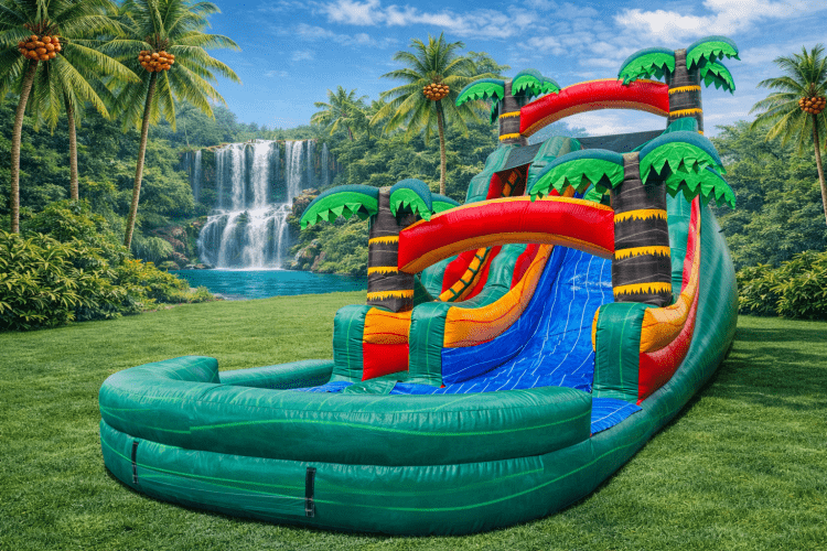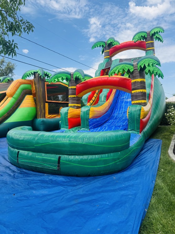 20-foot-tall Tropical Paradise that turns any event into an island escape — 15x32-foot attraction designed for big visual impact and active fun. Bold palm-tree and floral graphics make it an eye-catching centerpiece ideal for photo moments and themed celebrations. The generous footprint gives plenty of space for multiple kids (and adventurous adults) to play, climb, slide, or relax without feeling cramped. Built for rental use with heavy-duty materials, reinforced seams, and secure anchor points, it sets up and comes down efficiently when handled by trained crews. Mesh side panels provide clear sightlines so parents can supervise easily while keeping guests safely contained. Configurable features often include an open activity area, climbable elements, and a sweeping slide — with the option to add a splash attachment for warm-weather water play depending on the setup. Best suited to birthday parties, school or corporate family events, and tropical-themed gatherings, it pairs well with island décor and refreshment stations. Practical needs: a level surface at least 15x32 feet, reasonable access for delivery and setup, and a reliable power source for blower operation. The 20ft Tropical Paradise delivers striking visuals, spacious playroom, and dependable, crowd-pleasing entertainment for outdoor events.